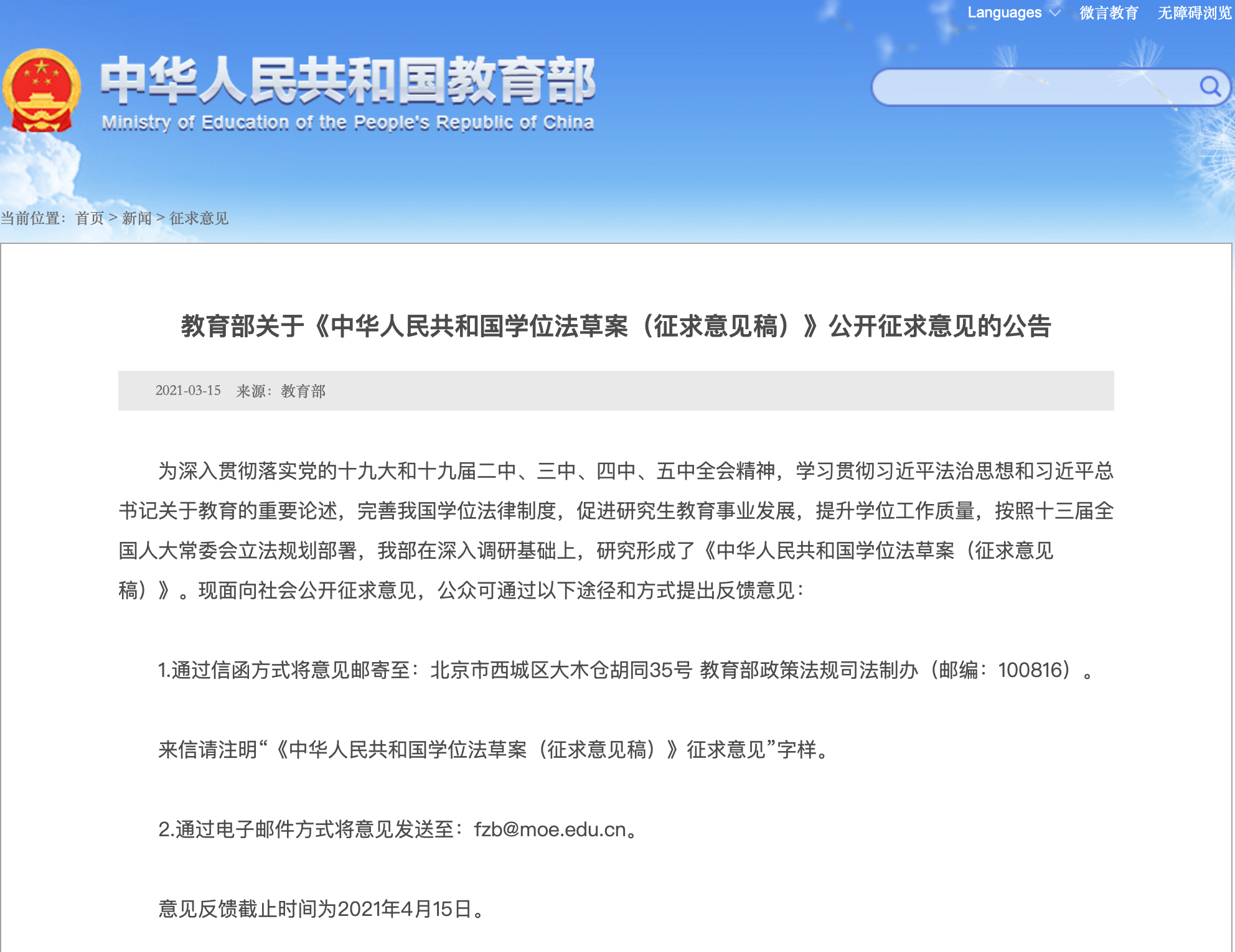 教育部网站消息,教育部近日公布《中华人民共和国学位法草案(征求意见稿)》(以下简称《征求意见稿》),并向社会公开征求意见。《征求意见稿》包括总则、学位管理体制、学位授予权的取得、学位授予条件、学位授予程序、学位质量保障与救济、附则等共七章38条。