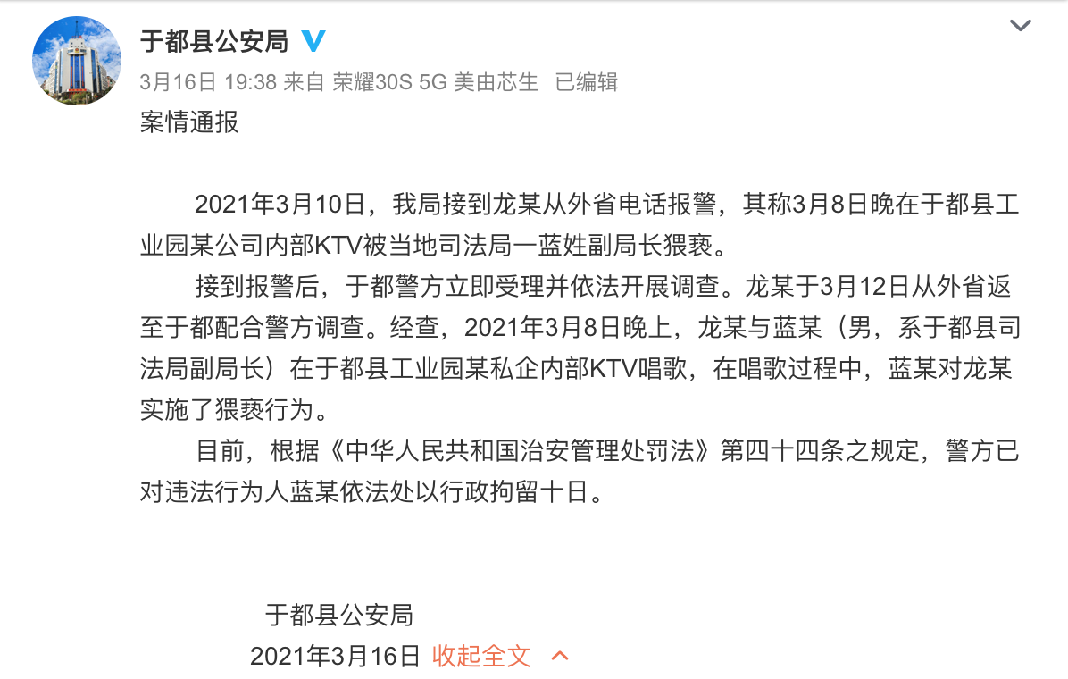 江西省于都县公安局3月16日晚间通报:2021年3月10日,我局接到龙某从外省电话报警,其称3月8日晚在于都县工业园某公司内部KTV被当地司法局一蓝姓副局长猥亵。