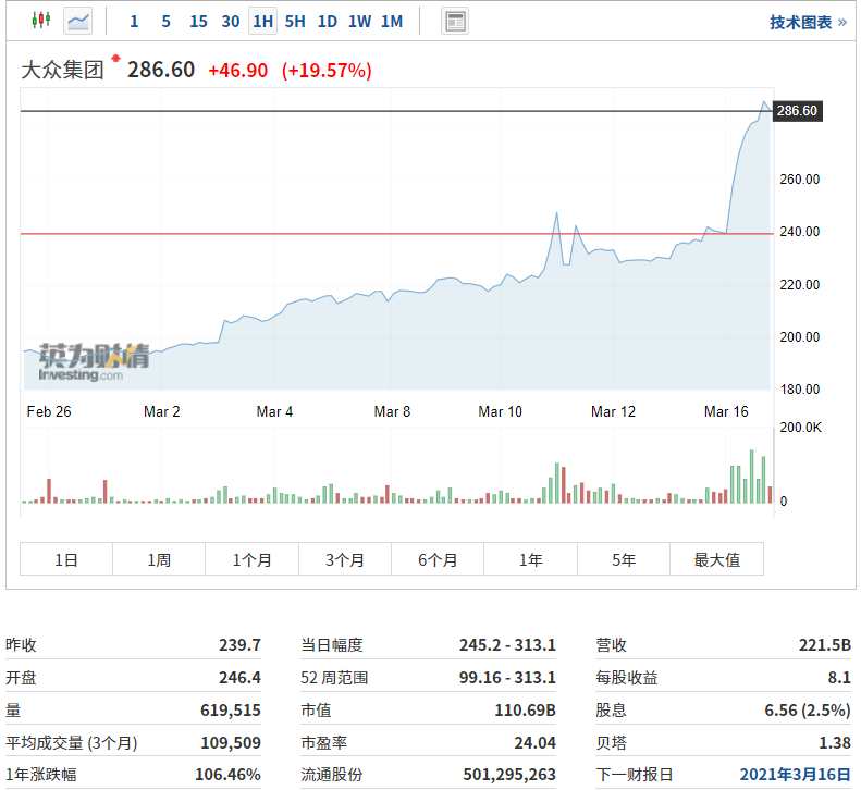 周二,老牌车企大众集团(Volkswagen AG)在法兰克福交易所一度大涨近30%,创十多年来的最大涨幅,现涨幅缩窄至19.57%,报286.6欧元/股。