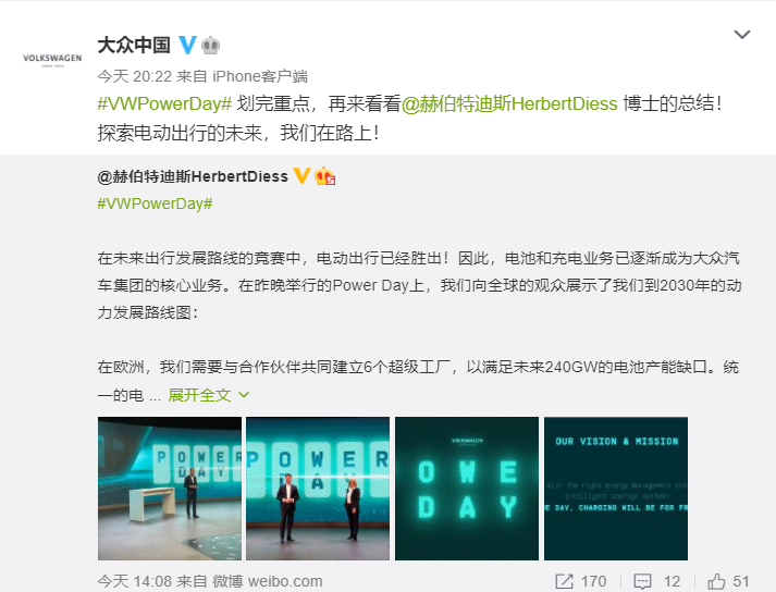 股价大涨的同时,今晚,大众中国官博转发了一条集团CEO赫伯特·迪斯下午发出的微博: