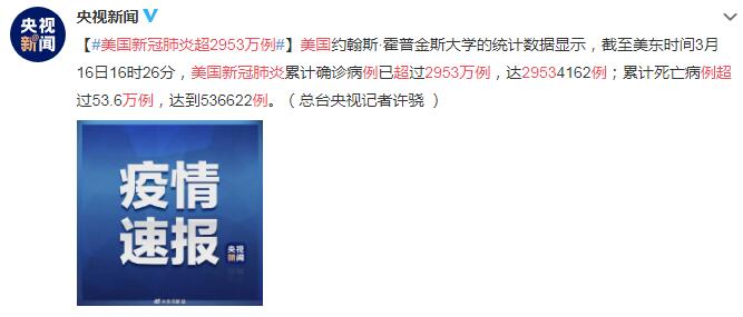 【美国新冠肺炎超2953万例】美国约翰斯·霍普金斯大学的统计数据显示,截至美东时间3月16日16时26分,美国新冠肺炎累计确诊病例已超过2953万例,达29534162例;累计死亡病例超过53.6万例,达到536622例。(总台央视记者许骁 )