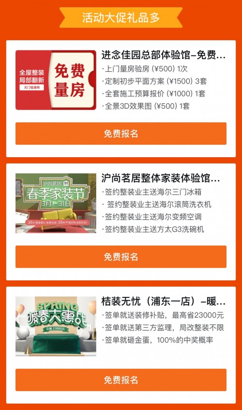 与此同时,用户还可以在活动页面每日签到参与抽奖活动,赢取多种家居装饰奖品。用户还可以报名参加装修不同商家组织的优惠活动,享受各地城市商家提供的免费量房、验房、装修质保等多种类型的福利保障。