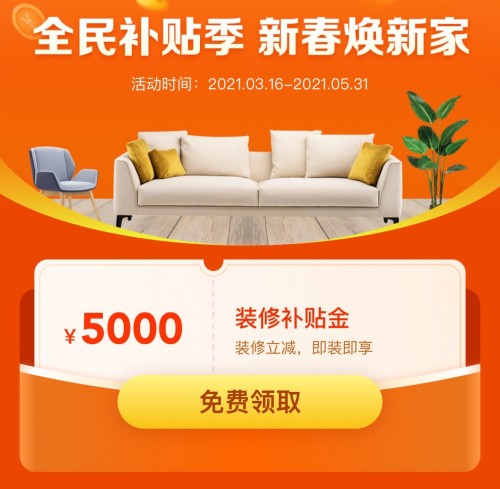 秉承“全民补贴季,新春焕新家”的主题,58同城、安居客携手多个家装品牌商家在装修、全屋定制、整体厨房、卫浴、涂料壁纸等服务领域,为用户准备了海量代金券,最高价值可达99000元。为进一步让全民享受到装修福利,58同城、安居客除了为参与活动的每位用户准备了5000元的装修补贴金,当用户装修金额满10万元即可获得,并以现金抵扣或代金券形式,在用户领取的城市使用。
