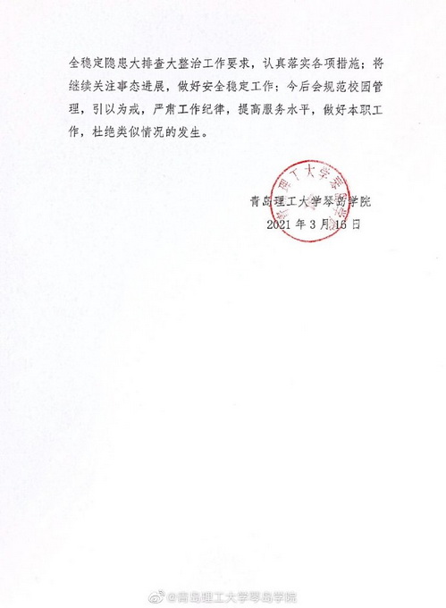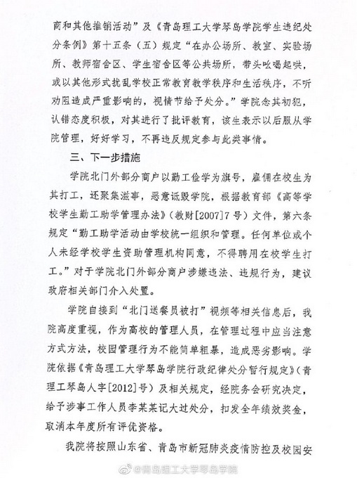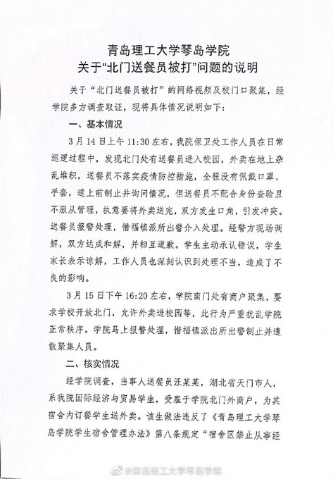 3月16日,@青岛理工大学琴岛学院 回应学生兼职送外卖遭保安掌掴:双方已达成和解并相互道歉。大学生汪某某兼职送外卖违反学校规定,已批评教育。保卫处李某某粗暴打人,记大过并扣发全年绩效奖金。