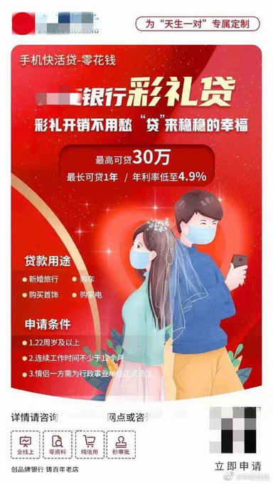 3月16日,一张江西九江银行的“彩礼贷”宣传海报在网上流传。九江银行一名客户经理表示,“彩礼贷”实际上就是“零花钱”。“贷了款,你可以用它买车,也能够用来做彩礼。”记者注意到,申请该“彩礼贷”必须满足三项条件,其中一项是情侣一方需为行政事业单位正式员工。对此,你怎么看?