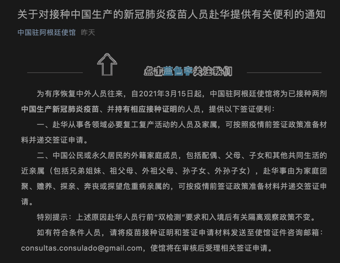 此外,同日,包括驻西班牙使馆、驻阿根廷使馆、驻越南使馆等在内的多个我驻外使馆都发布了类似通知,宣布对已接种中国生产的新冠肺炎疫苗,并持疫苗接种证明材料的签证申请人提供相关便利。