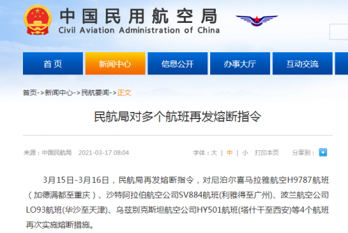 3月15日-3月16日,民航局再发熔断指令,对尼泊尔喜马拉雅航空H9787航班(加德满都至重庆)、沙特阿拉伯航空公司SV884航班(利雅得至广州)、波兰航空公司LO93航班(华沙至天津)、乌兹别克斯坦航空公司HY501航班(塔什干至西安)等4个航班再次实施熔断措施。