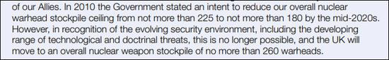 报告称,“考虑到不断变化的国安环境,包括各种技术和理论上的威胁,这个(2010年减少核弹头的承诺)已经不可能了,英国将把核武器的总储备提升到不超过260个核弹头。”