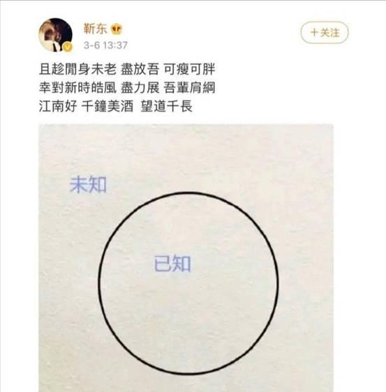 靳东发福后被不少网友吐槽撞脸华少。随后,靳东发文回应自己变胖“閒身未老,可瘦可胖”“吾輩肩綱”。还配了一张图,是一个黑色的圆圈里圈着已知,黑色的圆圈外都是未知。