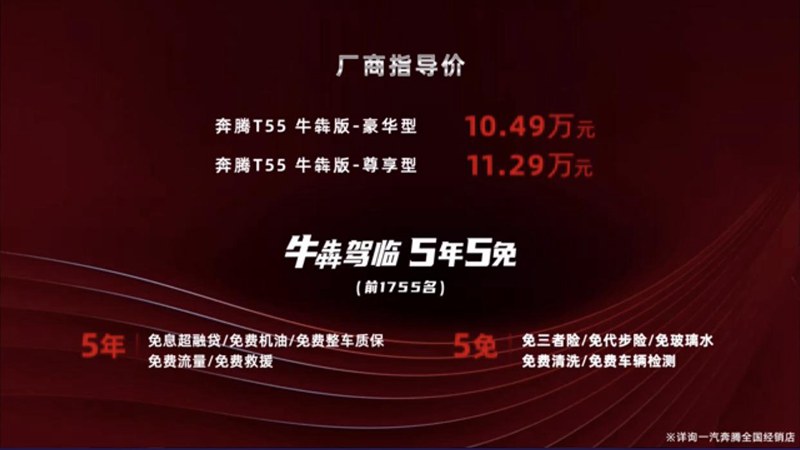 目前,新升代购车心理日趋理性,购车已不单纯是“购买”,他们更看重用车、养车时的服务。为此,一汽奔腾持续践行“为用户出行创造惊喜”的品牌理念,针对奔腾T55牛犇版推出10.49-11.29万元售价,极大为用户降低购车门槛。在此基础上,推出“牛犇驾临,5年5免”购车政策,进一步减轻购车压力。