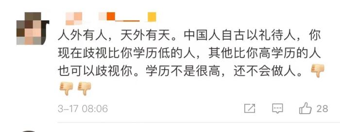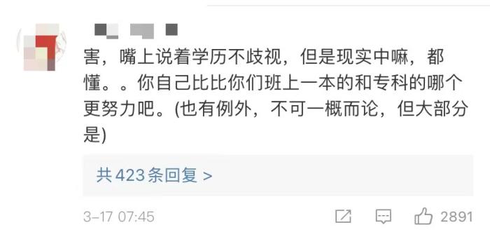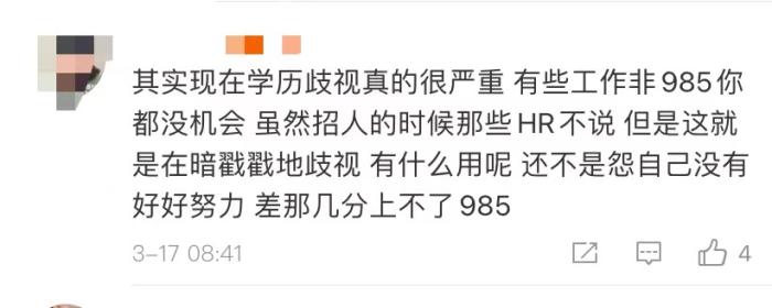 对于招聘企业学历歧视,不少人感慨,这是很现实的事,没有什么更好的解决办法,因为社会竞争很残酷。甚至有网友列出了求职时的学历“鄙视链”:国外的常青藤鄙视国内的985,985鄙视211,211鄙视普通一本,普通一本鄙视二、三本……