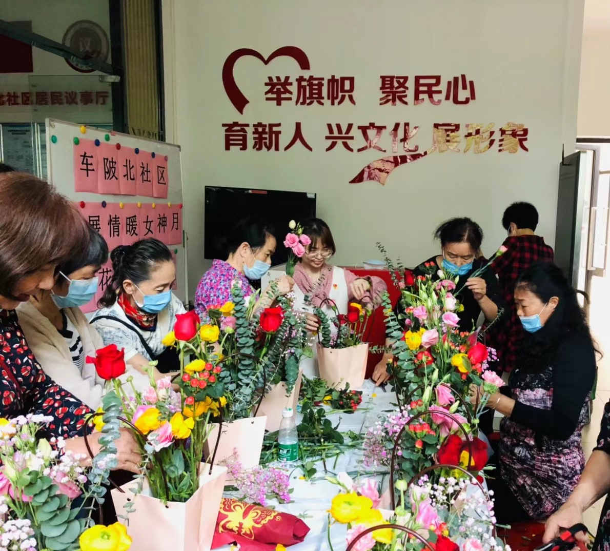 桃花开,燕归来。刚刚过去的第110个“三八”国际劳动妇女节很特殊,在抗击新冠肺炎疫情一线的“她力量”——社区工作者和志愿者中的女性同胞群防群控日夜坚守,用无私无畏展现女性风采,以担当作为贡献巾帼力量。她们的辛劳和付出、奉献和牺牲,感动着无数的人们,也为自己的节日增添了动人的光彩。3月16日,车陂北社区在星光老人之家开展插花、献花活动,向身边的每一个“她”致以深深的敬意,辖内女性近30人参加了此次活动。