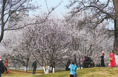 近日,明城墙遗址公园内山桃花绽放,春天的气息扑面而来。本报记者 刘平摄