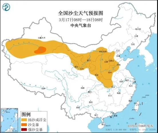 17日6时,中央气象台继续发布沙尘暴蓝色预警。预计17日8时至18日8时,新疆南疆盆地和东部、内蒙古西部、青海东北部、甘肃、宁夏、陕西中北部、山西、河北中南部、山东西部、河南中西部、湖北中西部等地的部分地区有扬沙或浮尘天气,其中新疆南疆盆地局地有沙尘暴。