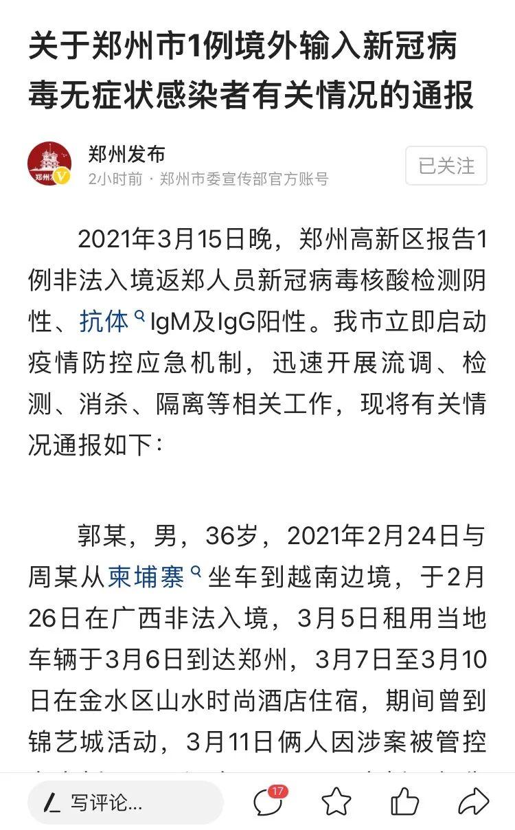 河南日报微信消息:2021年3月15日晚,郑州高新区报告1例非法入境返郑人员新冠病毒核酸检测阴性、抗体IgM及IgG阳性。 我市立即启动疫情防控应急机制,迅速开展流调、检测、消杀、隔离等相关工作,现将有关情况通报如下: