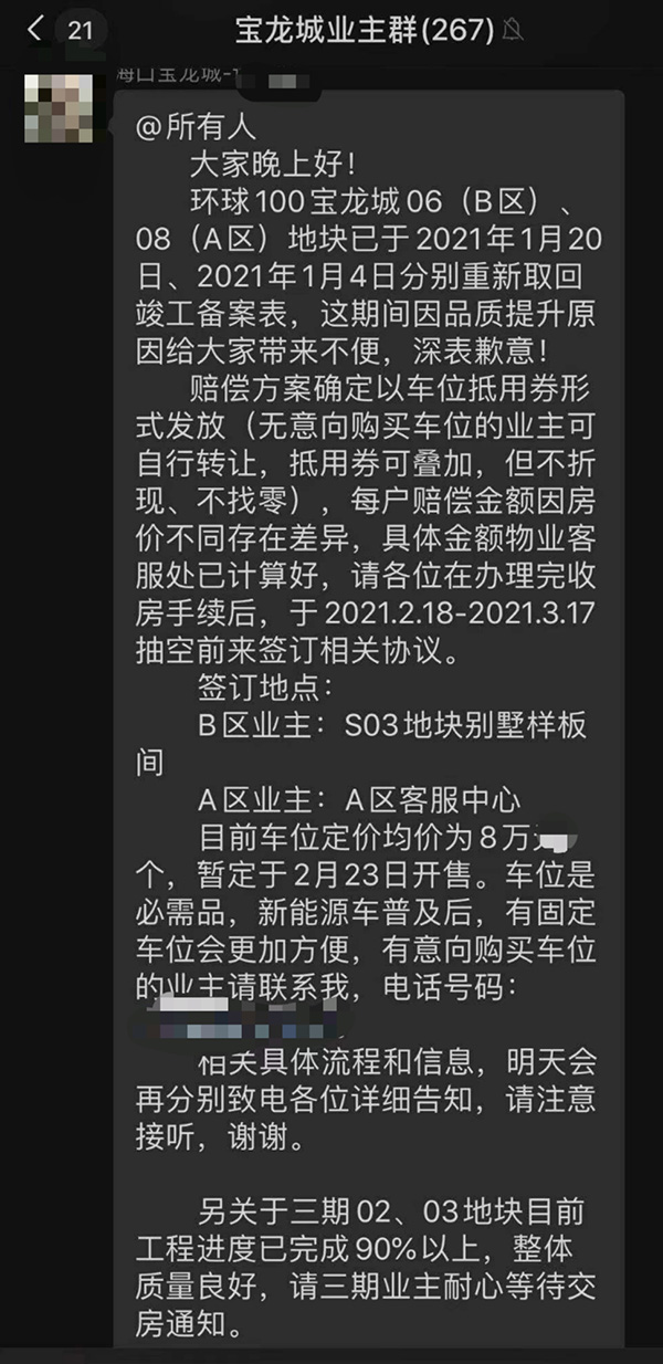 王先生提供的一张“宝龙城业主群”的微信聊天截图显示,备注为“海口宝龙城XXX”的账号发消息通知称:环球100宝龙城(B区)和(A区)已于2021年1月20日、2021年1月4日分别重新取回竣工备案表,这期间因品质提升原因给大家带来不便,深表歉意。赔偿方案以车位抵用券形式发放(无意向购买车位的业主可自行转让,抵用券可叠加,但不折现,不找零)。