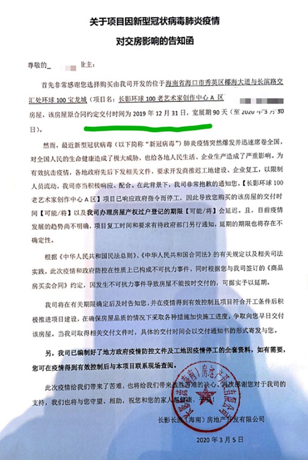 张玲提供的《关于项目因新型冠状病毒肺炎疫情对交房影响的告知函》 本文图均为受访者供图