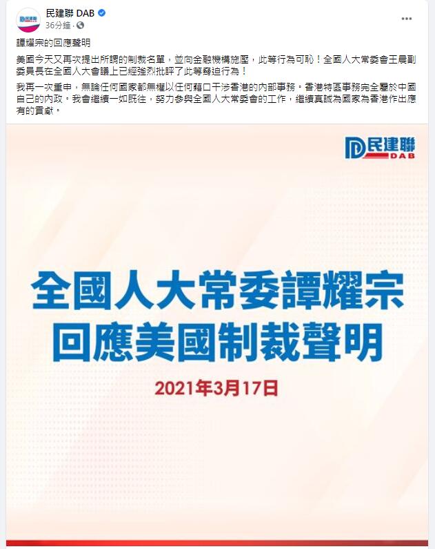 海外网3月17日电 美国国务院17日宣布对此前实施旅行限制的14名中方官员进一步施加所谓金融“制裁”,包括全国人大常委会委员、民建联会务顾问谭耀宗。港媒称,这是美国企图“报复”中方完善香港选举制度的决定。谭耀宗当天发声指美国此等行为可耻,自己会一如既往为国家为香港作出应有的贡献。