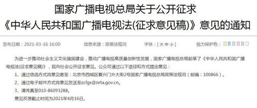 国家广播电视总局网站16日发布消息,为进一步推动社会主义文化强国建设,推动广播电视高质量创新性发展,国家广播电视总局起草了《中华人民共和国广播电视法(征求意见稿)》,现向社会公开征求意见。