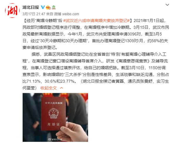 【经历“离婚冷静期”后 武汉近六成申请离婚夫妻放弃登记】2021年1月1日起,民政部对婚姻登记程序进行调整,在离婚程序中增加冷静期。3月15日,武汉市民政局最新离婚数据显示,今年1月,武汉市共受理离婚申请3096对,截至3月5日,经过“30天冷静期和30天办理期”,首批办理离婚登记1309对/月,约58%的夫妻申请后放弃登记。
