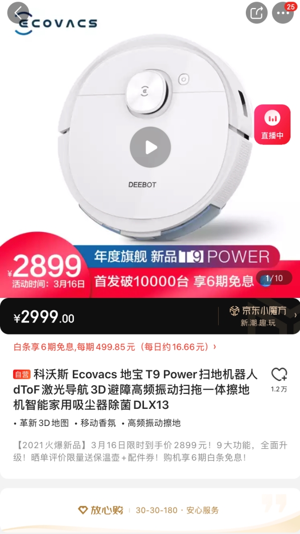 近日,京东独家定制款科沃斯 Ecovacs 地宝T9 Power扫地机器人在科沃斯京东自营旗舰店独家首发。上市第一天就迎来销售大爆发,销量突破1万台,当日成交额比上一代爆品T8增长了728%,创造行业单品首发销量新纪录。