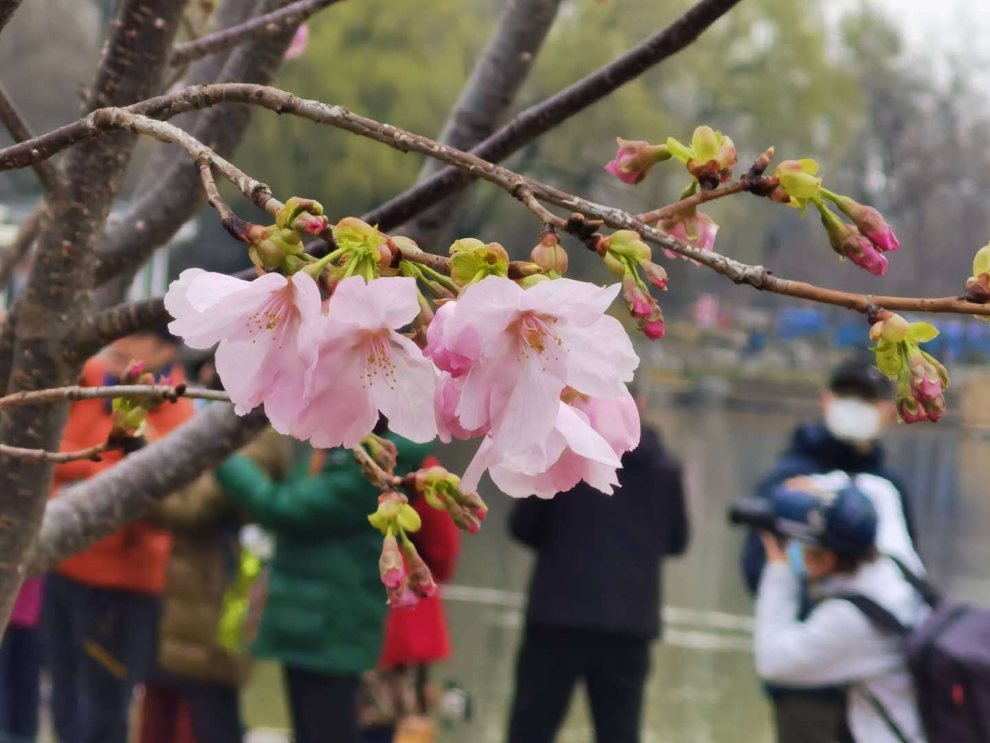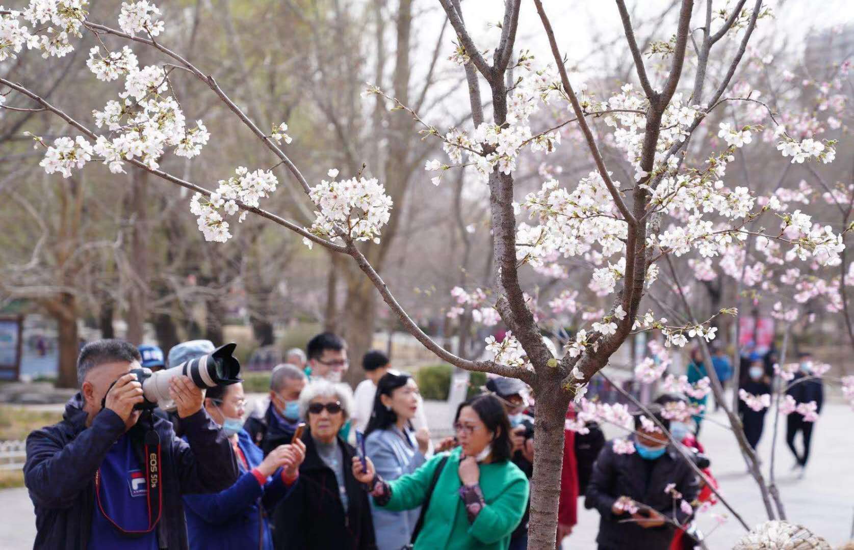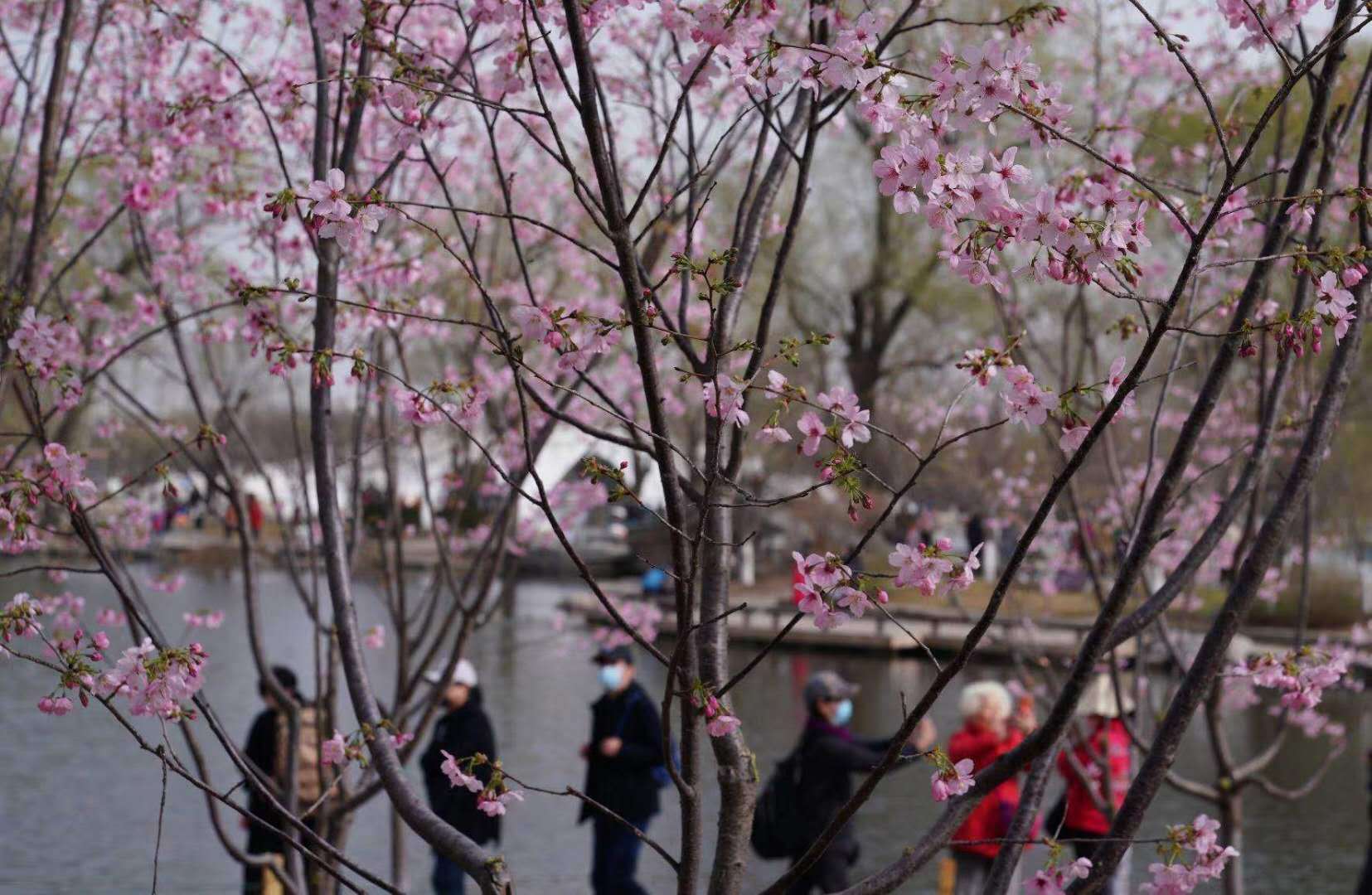 3月18日,游客在玉渊潭公园樱花园里欣赏初放的杭州早樱。随着春暖花开,到公园踏青赏花的游客市民逐渐增多,玉渊潭公园也在做好疫情防控的基础上,开启2021年春季赏花文化活动暨樱花鲁冰花花卉联展,满足游客们的赏花愿望。