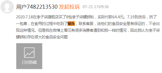 对此事件,李子柒品牌客服中心回应称,公司没有进行相关的操作(投诉),后续会对消费者反馈的问题进行核实。