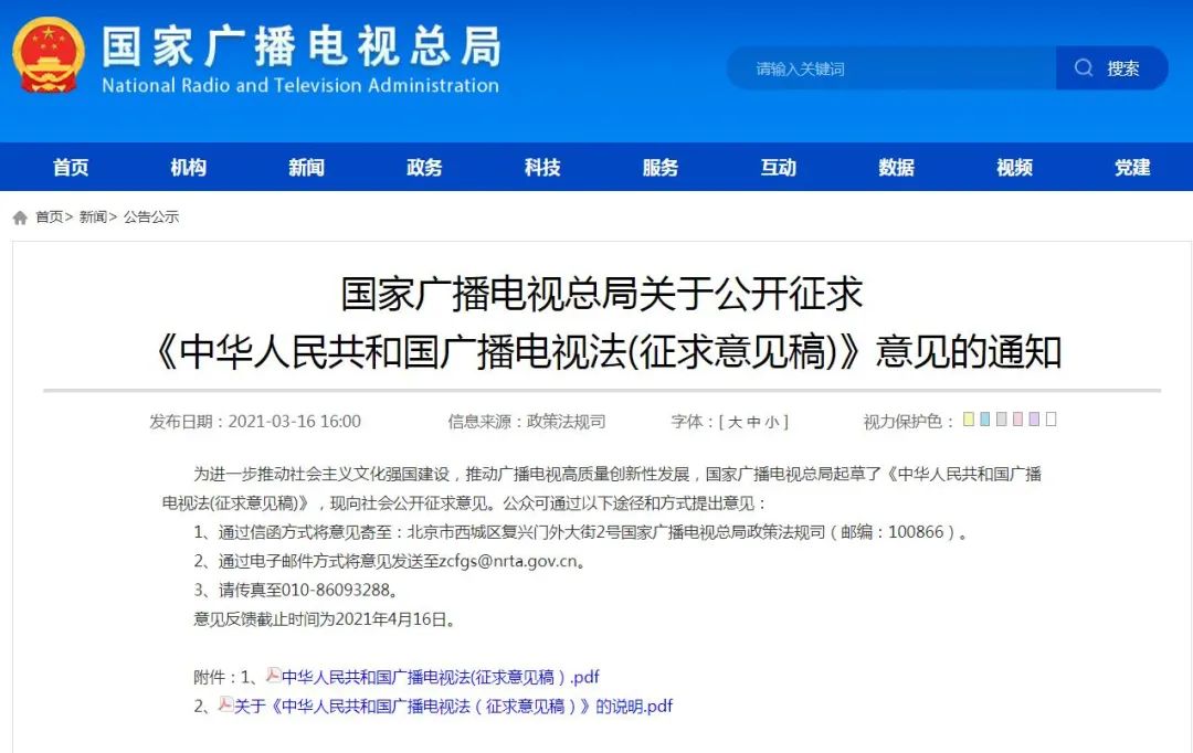 3月16日,国家广播电视总局公布《中华人民共和国广播电视法(征求意见稿)》(下称征求意见稿),向社会公开征求意见。