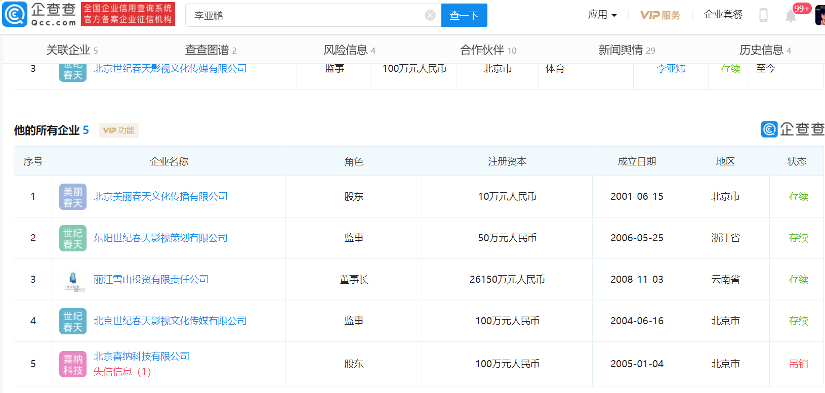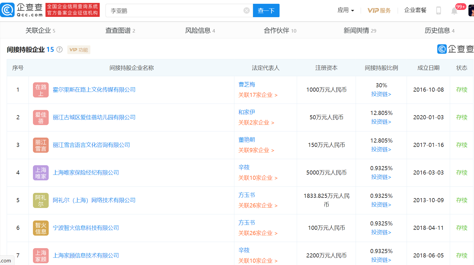 企查查APP显示,李亚鹏的企业共有5家,其中,北京喜纳科技有限公司已吊销,李亚鹏对丽江雪山投资有限责任公司持股27.84%,并担任董事长职务,该公司的经营范围包含房地产开发、文化产业投资,2019年9月10日,李亚鹏在丽江雪山投资有限责任公司所持7279.35万元人民币股权已被冻结。另外,李亚鹏间接持股企业有15家,涵盖文化传媒、幼儿园、保险经纪、区块链公司、互联网金融等。其中,霍尔果斯在路上文化传媒有限公司股权遭冻结、执行通知文号为(2021)京03执保109号。