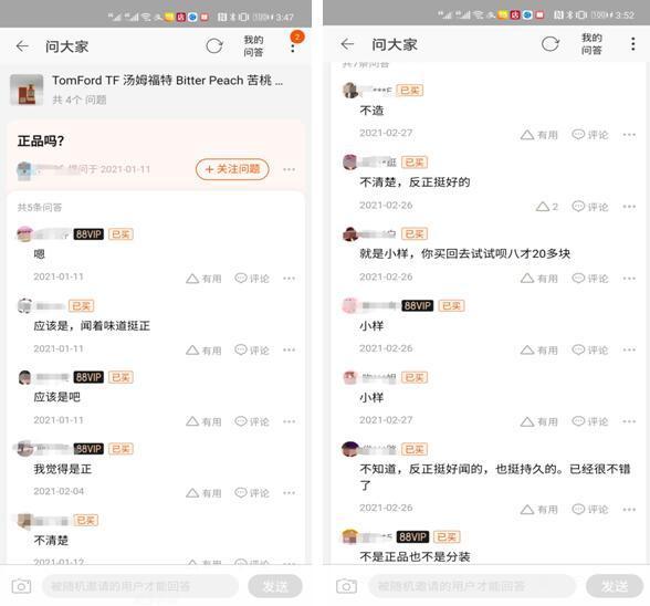口说无凭,又没购买记录,怎么能保证产品的安全?不少顾客也有同样的困惑,问及“是正品吗”,已购消费者一般都给予“不知道,反正挺好闻的”“应该是吧”“不清楚”“不是正品也不是分装”等不确定回答。