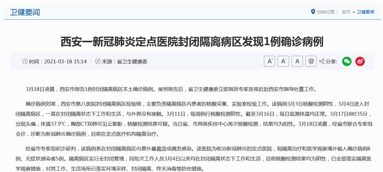 3月18日凌晨,西安市报告1例封闭隔离病区本土确诊病例。接到报告后,省卫生健康委立即指派专家连夜赶赴西安市指导处置工作。