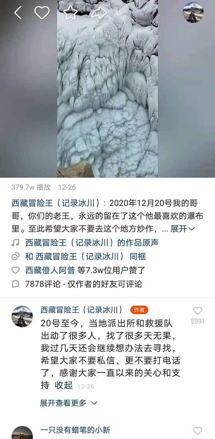 12月26日,快手用户“西藏冒险王(记录冰川)”发文称,老王(王相军)“ 永远留在了这个他最喜欢的瀑布里”。