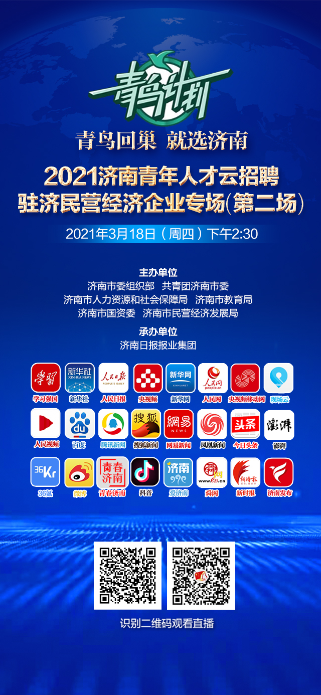 为助力“强省会”建设,进一步服务全市招才引智工作大局,3月18日,由市委组织部、团市委、市人社局、市教育局、市国资委、市民营经济局主办,济南日报报业集团承办的“青鸟回巢 就选济南”2021济南青年人才云招聘驻济民营经济企业专场第二场顺利举办,更好地实现岗位信息和青年人才信息精准匹配,促进更多高校毕业生就业创业。