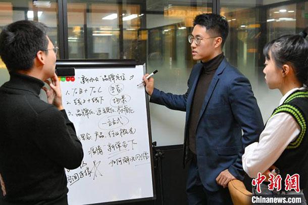 戴健进正在与团队探讨“新办公”品牌定位。 陈骥旻 摄