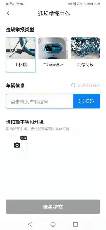 哈啰出行方面表示,市民可通过哈啰出行App或小程序进入哈啰单车页面,选择“发现违规”方式进行举报。