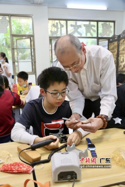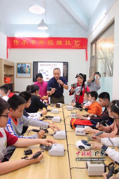 中新网广东新闻3月18日电 (程景伟 伍嘉瑶)“非遗+体验”国家级非遗项目(广州榄雕)研学之旅志愿活动日前在晓港公园曾氏榄雕研学传承基地举办。来自广州市华侨外国语学校的学生,学习榄雕技艺,感受工匠精神。