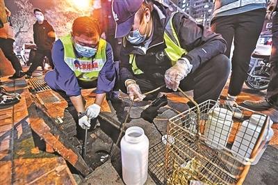 在丰台区安乐林路与蒲黄榆二巷交叉路口的西北角,分布着多家麻辣烫、家常菜、拉面等餐厅。3月17日18时30分,北京青年报记者跟随一队执法人员来到这里。执法人员先用铁钩打开排水井,将水瓶吊送进去进行水样取证。