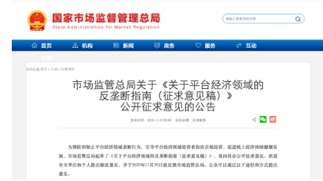 《关于平台经济领域的反垄断指南(征求意见稿)》公开征求意见(图源:国家市场监督管理总局)