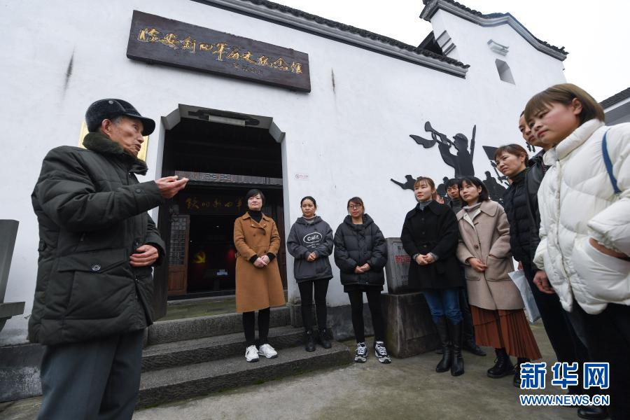 3月18日,在杭州市临安区板桥镇的临安新四军历史纪念馆,90岁的孟永迪老人(左一)在给乡镇的入党积极分子讲述革命历史和他自己参加过的解放战争的亲身经历。
