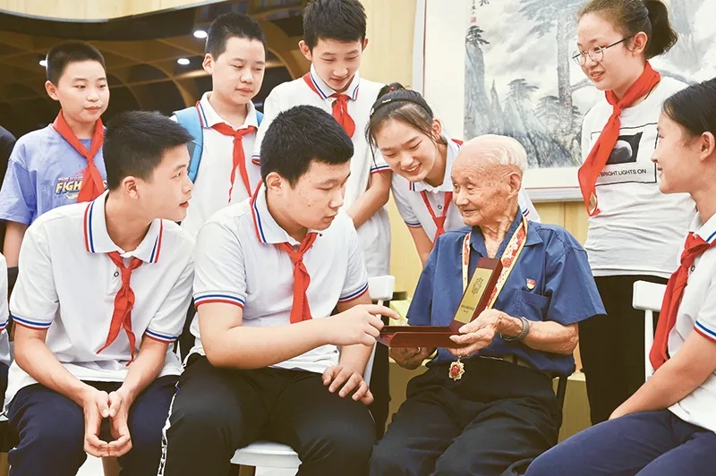2020年8月23日,安徽省合肥市薛河湾社区举行“听老兵讲故事”爱国主义主题教育活动,少先队员们聆听老兵讲述抗战故事,铭记战争的苦难与胜利的光荣。图为学生们在听九旬老兵施长明讲自己当年的战斗故事。中新社记者韩苏原/摄