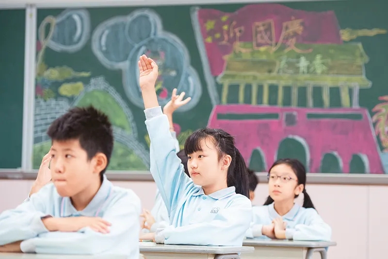 澳门中小学学生使用的教材《品德与公民》中有丰富的关于国情、国旗、国歌的内容,学生们可以从中学到很多关于祖国的知识,培养对祖国和澳门的感情。图为2019年11月25日,澳门濠江中学附属英才学校的学生在课堂上举手回答老师提问。新华社记者张金加/摄