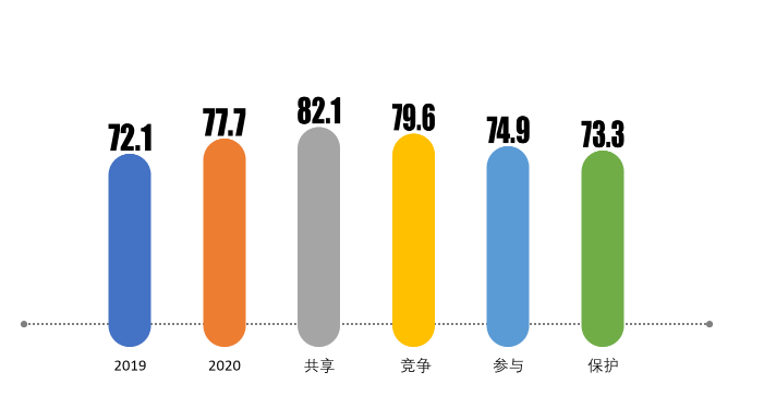 调研结果显示,2020年我国数字经济服务质量满意度77.7分,比2019年提高5.6分,表现良好。数字经济服务质量整体有所改进,短板主要来自消费者参与不足、消费者保护程度不够。数字经济服务质量满意度四个一级指标得分分别为:共享指数82.1分、竞争指数79.6分、参与指数74.9分、保护指数73.3分。