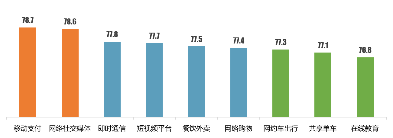2020年各业态满意度得分较上一年增长明显,不同业态的数字经济服务质量满意度总体得分均在76分以上,移动支付(78.7)和网络社交媒体(78.6)满意度最高;即时通信(77.8)、短视频平台(77.7)、餐饮外卖(77.5)、网络购物(77.4)满意度分列第三到六位;网约车出行(77.3)、共享单车(77.1)和在线教育(76.8)得分较低。不同业态数字经济服务质量满意度差距不大,最高与最低差距不足2分。