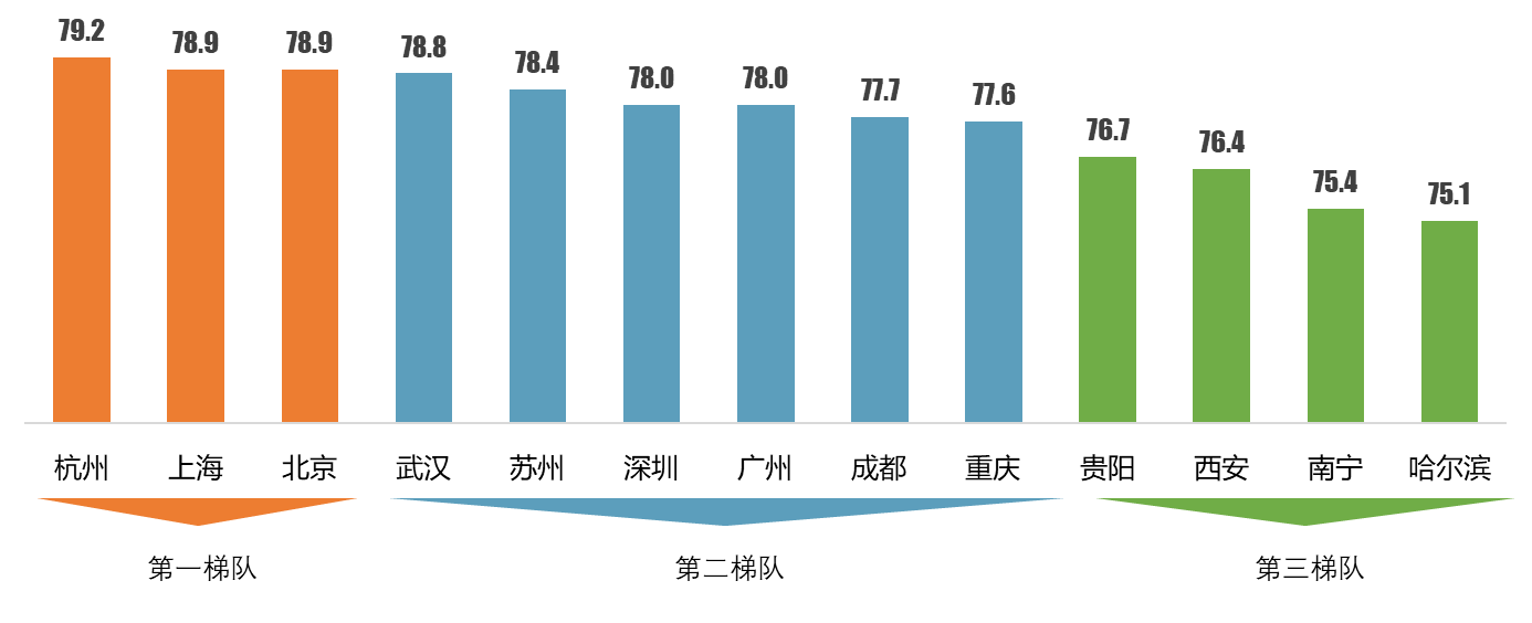 调研城市的数字经济服务质量满意度较上一年均有所提升。排名上,武汉由上一年的第五名超越苏州跃居第四,其余城市排名未发生明显变化。数字经济服务质量满意度是一个综合性的发展测度指标,受地区经济发展水平、数字经济发展现状、数字经济发展潜力等多方面因素影响。当前,我国数字经济服务质量满意度呈现自东向西逐渐减弱的特点。杭州(79.2)、上海(78.9)、北京(78.9)处于数字经济服务质量满意度的第一梯队(排名前三)。武汉(78.8)、苏州(78.4)、深圳(78)、广州(78)、成都(77.7)、重庆(77.6)处于第二梯队。贵阳(76.7)、西安(76.4)、南宁(75.4)、哈尔滨(75.1)处于第三梯队。