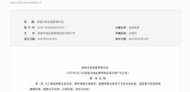 国家市场监督管理总局网站发布《网络交易监督管理办法》