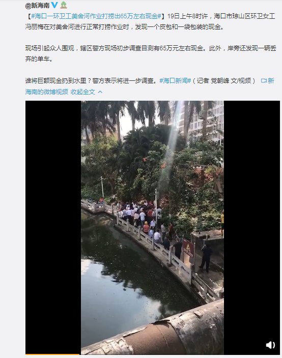 原标题:海口一环卫工美舍河作业打捞出65万左右现金