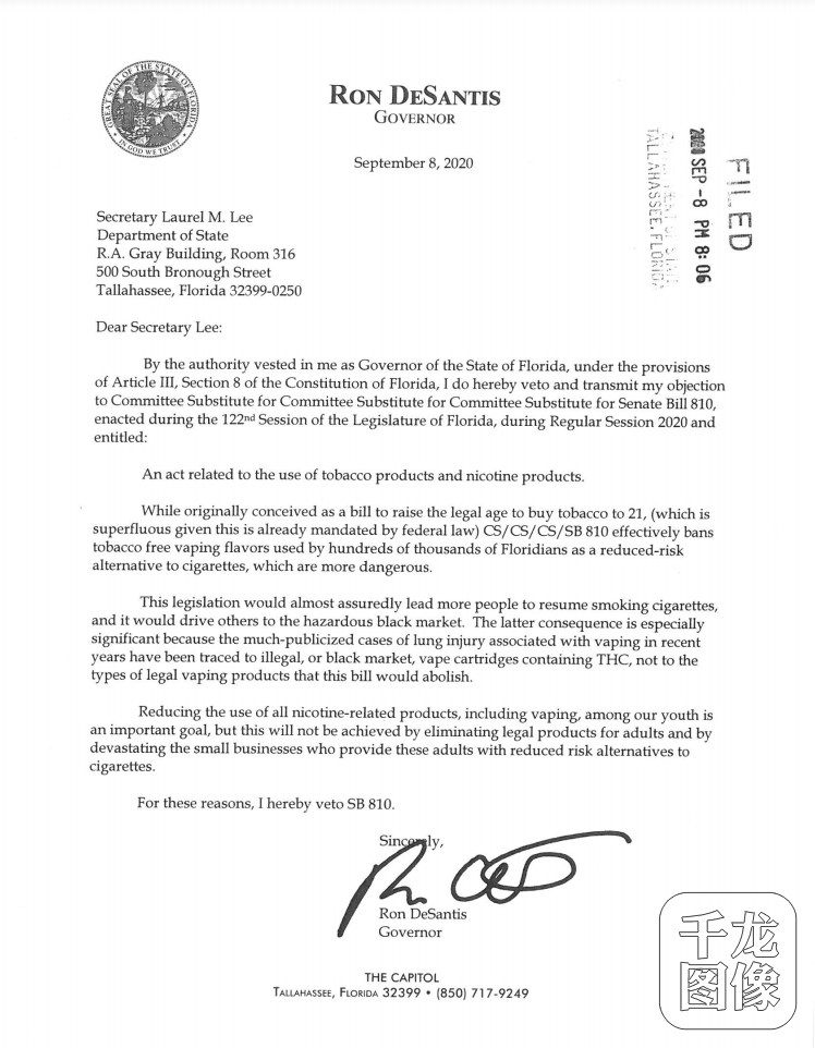 佛罗里达州州长罗恩·德桑蒂斯的签名信。他是第一位否决通过州参议院和众议院的电子烟口味禁令的人。