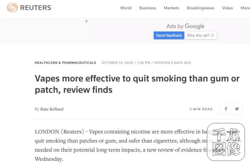 (路透社报道考克兰总数研究成果:《评论发现:相比于尼古丁口香糖或贴剂,电子烟戒烟更有效》