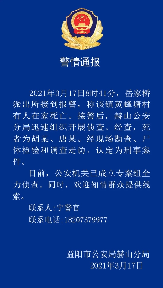 经查,死者为胡某、唐某。经现场勘査、尸体检验和调走访,认定为刑事案件。目前,公安机关已成立专案组全力侦查。同时,欢迎知情群众提供线索。