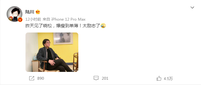 3月18日,导演陆川晒出一张高晓松近照,透露自己昨天见到了高晓松,“暴瘦到单薄!太励志了。”照片中,高晓松身穿夹克,看着瘦了不少,脸也小了一圈。据悉,去年11月高晓松曾透露自己26天瘦了26斤。